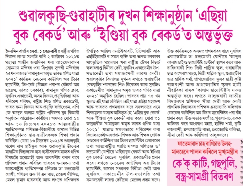 শুৱালকুছি-গুৱাহাটীৰ দুখন শিক্ষানুস্থান 'এছিয়া বুক ৰেকৰ্ড' আৰু 'ইণ্ডিয়া বুক ৰেকৰ্ড'ত অন্তৰ্ভুক্ত
